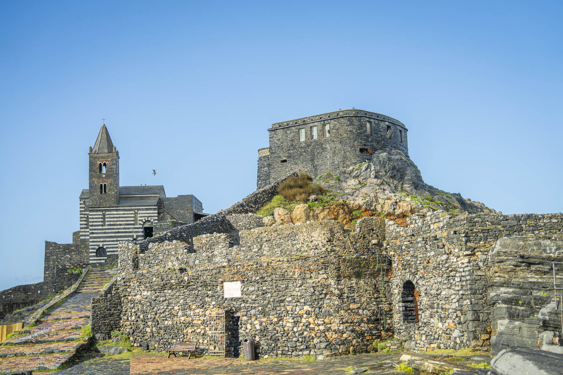 Il Sentiero Uno ha il suo inizio nel cuore di Porto Venere, precisamente in Piazza Bastreri, uno degli insediamenti costieri più significativi del sito Patrimonio Mondiale. Da qui, si imbocca la salita pedonale e l’ascesa verso il Castello Doria attraversa un paesaggio urbano storicamente stratificato, in armonioso dialogo con la morfologia scoscesa della costa. Si raccomanda di prestare particolare attenzione durante questo tratto iniziale, poiché la scalinata è ripida e, in determinate condizioni, potrebbe essere scivolosa.